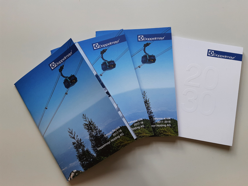 Im Geschäftsbericht der Doppelmayr Gruppe wird auf nur 36 Seiten DIN A5 in strategischen Short Stories erklärt, wie der Ertrag der Gruppe entstanden ist, welche Strategien in den verschiedenen Gesellschaften und Ländern erfolgreich eingesetzt wurden. Die stetige Entwicklung des Unternehmens in Richtung der kommunizierten Vision 2030 wird für alle Mitarbeiter – als wichtigste Empfängergruppe des Geschäftsberichts – lesbar. Unsere erstklassigen Designpartner in Amsterdam und Grafikpartner in Lustenau haben erneut zur qualitätsvollen Umsetzung beigetragen.